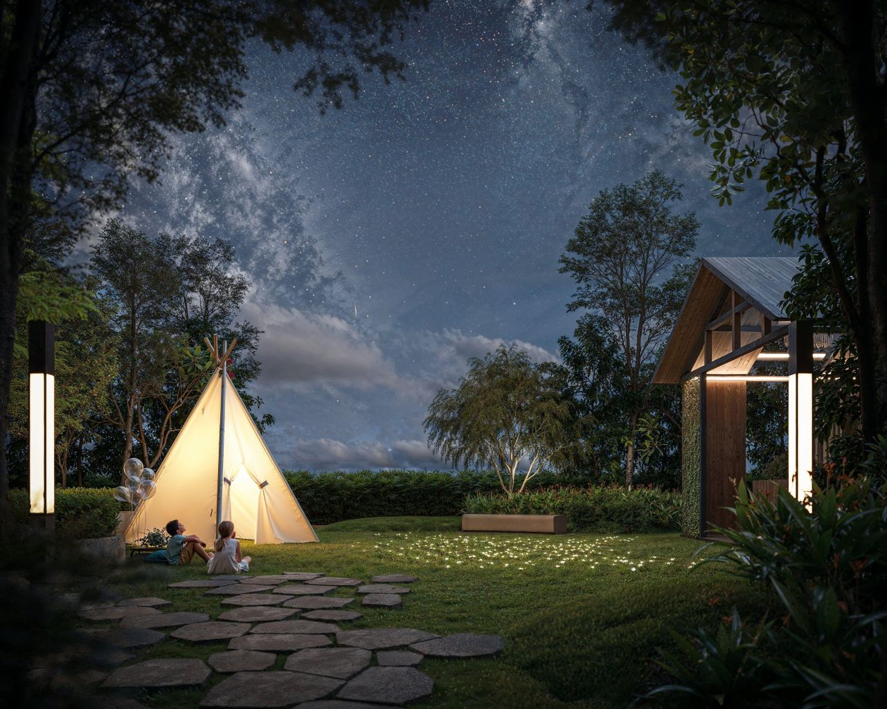 The starry lawn at Gen Rise offers a magical escape under the night sky, perfect for serene evenings and cherished moments with loved ones.